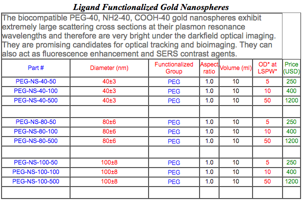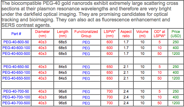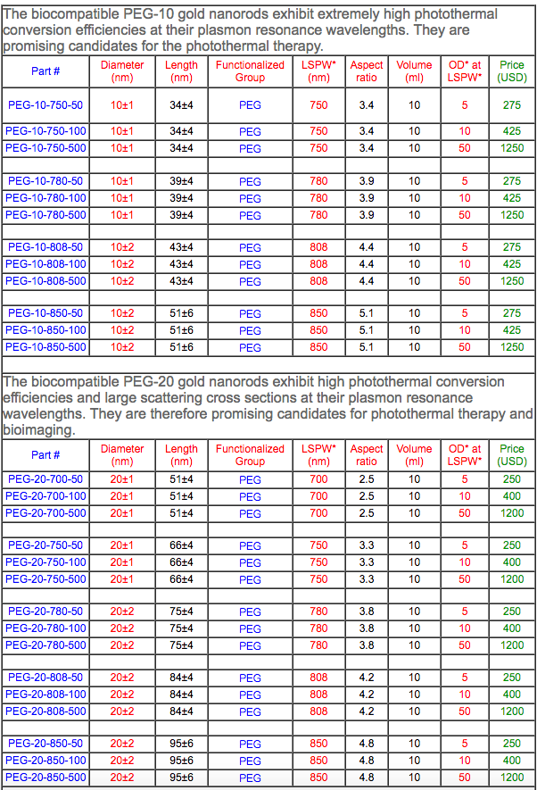 NanoSeedz™功能化金纳米棒溶于去离子水中。聚乙二醇化金纳米棒具有良好的生物相容性,可分散于多种极性有机溶剂中,包括乙醇、甲醇、丙酮、乙腈、DMF、DMSO和PBS。